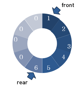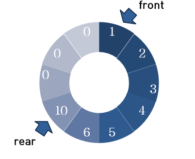 int front, rear; // 생성시 기본 값은 -1, -1로 초기화한다.