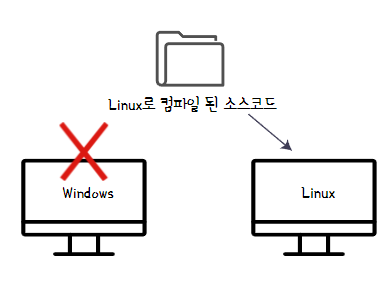 > 즉, 윈도우에서 컴파일한 실행코드가 리눅스 환경에서는 동작하지 않았습니다. 이는 코드가 운영체제에 종속적라는 뜻입니다.
