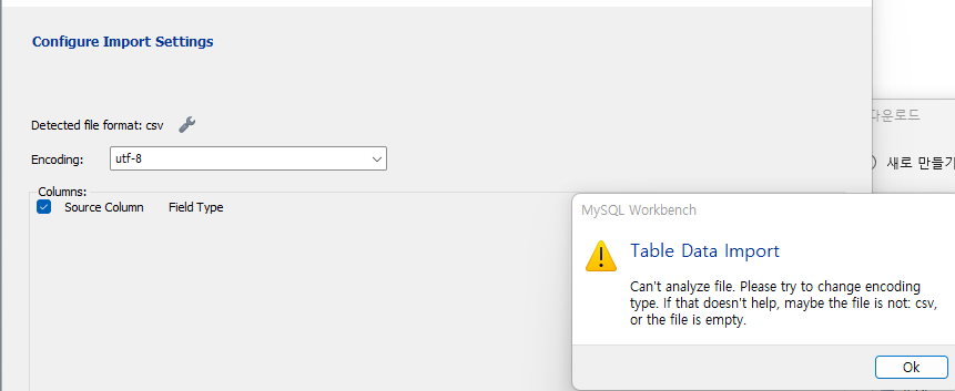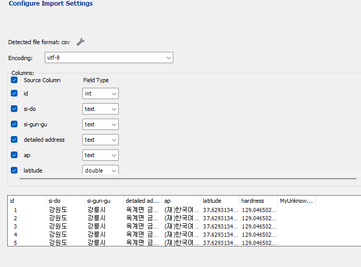 다시 table data import wizard를 통해 csv파일을 import 하면 아래와 같이 잘 읽어오는 것을 확인 할 수 있다.