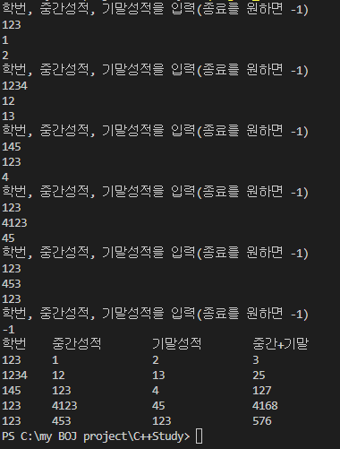 cout<<"학번, 중간성적, 기말성적을 입력(종료를 원하면 -1)"<<endl;